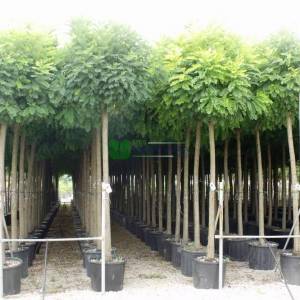 Robinia is a deciduous tree, native to North America. Spiky branches are covered by long leaves composed of many leaflets. There are some species with white or pink flowers. Rooting system is creeping and invasive. They are resistant to cold, drought, and air pollution and sea conditions. They can grow in any soil, but lime soil. They grow fast and can be pruned. They can be used as avenue trees in landscaping.